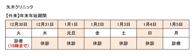 矢木クリニックでは、年末年始期間は、下記の通り診療・休診させていただきます。