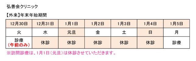 弘善会クリニックでは、年末年始期間は、下記の通り診療・休診させていただきます。