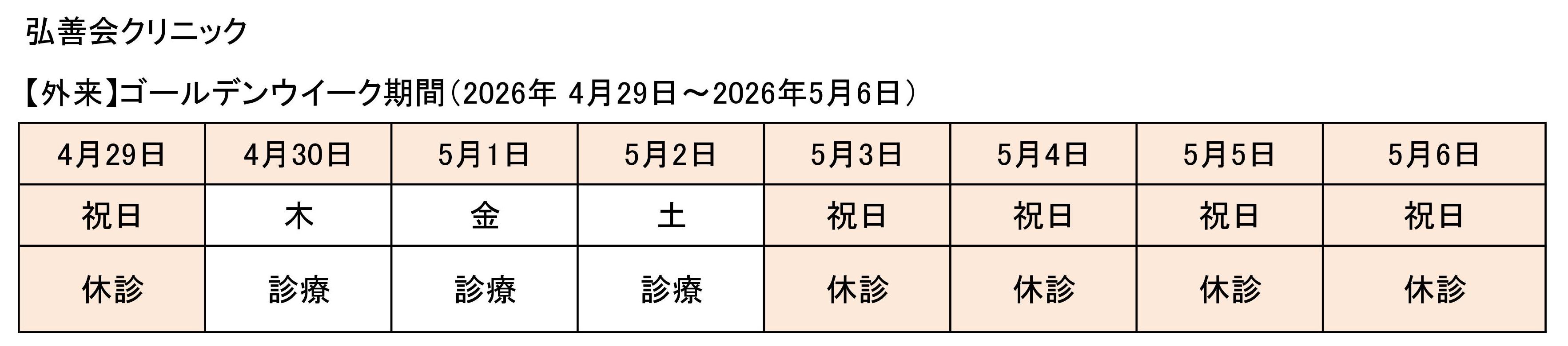 ゴールデンウイーク期間(2026年 4月29日~2026年5月6日)は、外来は下記の通り診療・休診させていただきます。