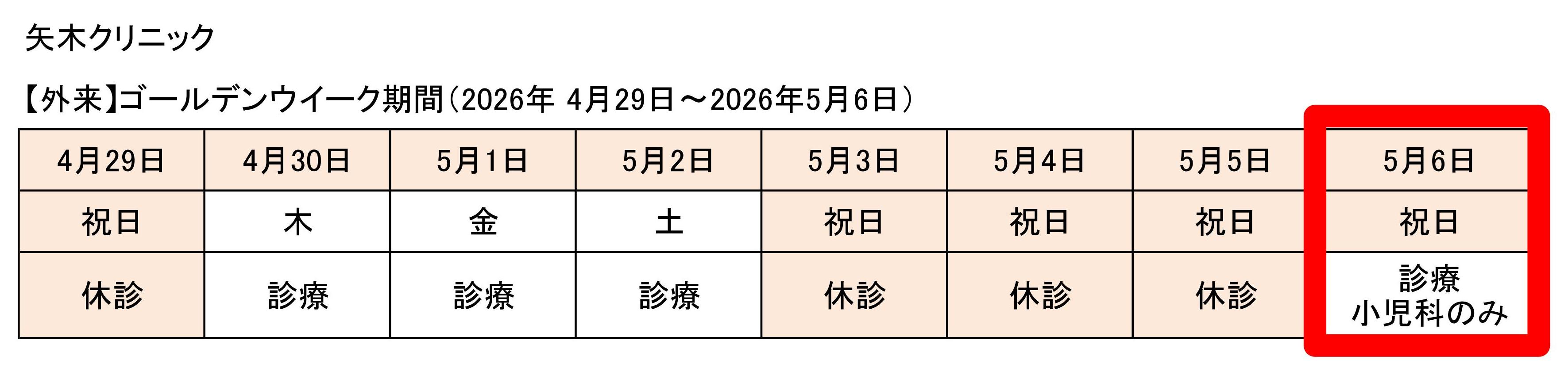 ※5月6日(祝日)は、小児科(舟本医師)のみ診療を行います。