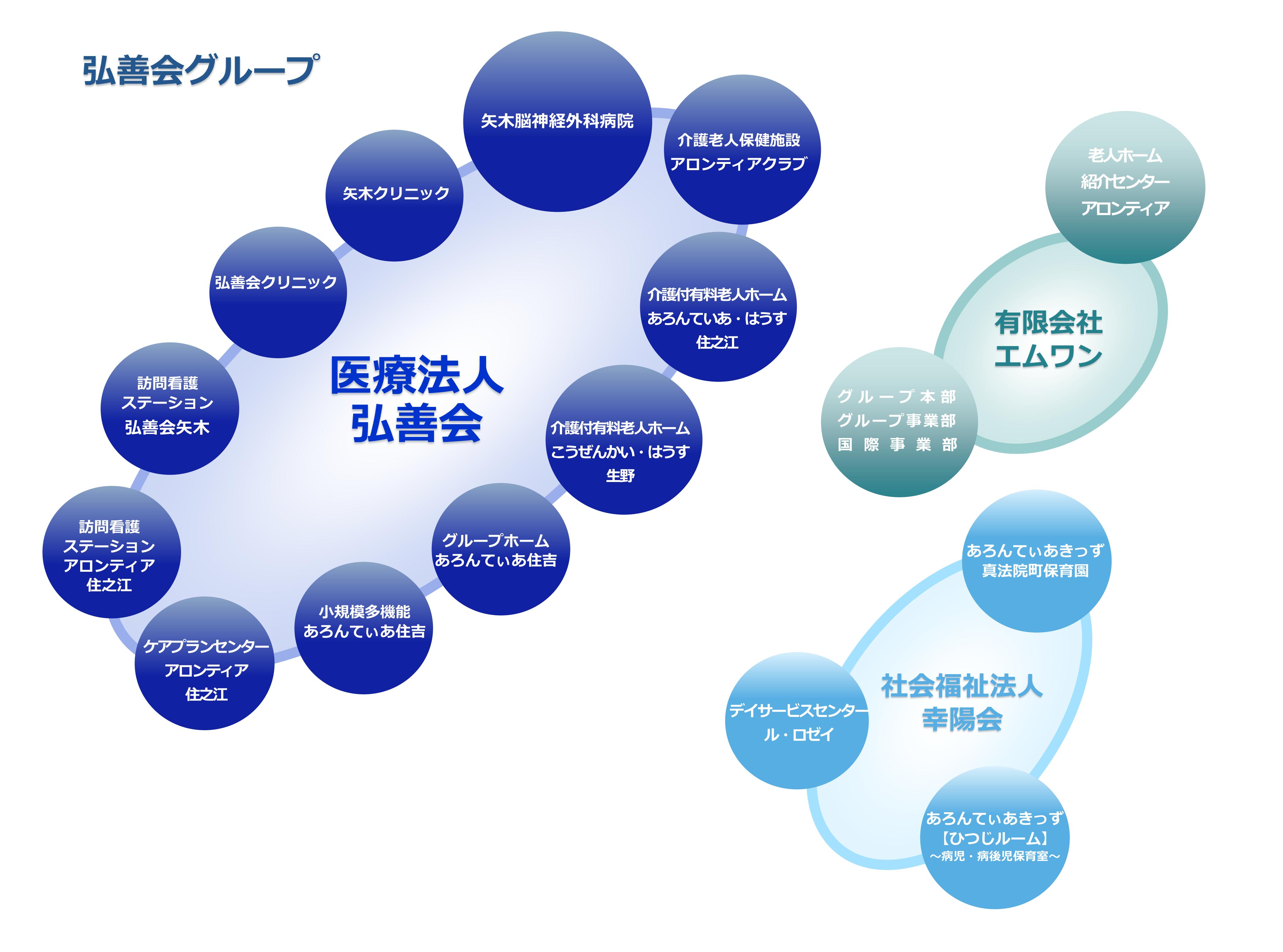 | 医療法人 弘善会 | 矢木脳神経外科病院、 介護老人保健施設 アロンティアクラブ、 矢木クリニック、 弘善会クリニック、 訪問看護ステーション 弘善会矢木、 訪問看護ステーション アロンティア住之江、 ケアプランセンター アロンティア住之江、 グループホーム あろんてぃあ住吉、 小規模多機能 あろんてぃあ住吉、 介護付有料老人ホーム あろんてぃあ・はうす住之江、 介護付有料老人ホーム こうぜんかい・はうす生野 |